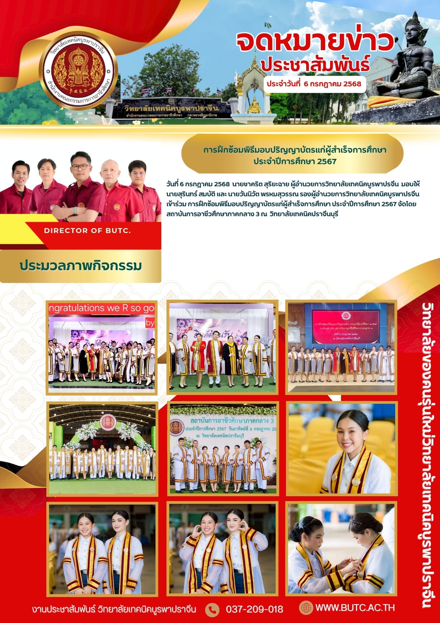 วันที่ 6 กรกฎาคม 2568 นายชาคริต สุริยะฉาย ผู้อำนวยการวิทยาลัยเทคนิคบูรพาปรจีน มอบให้นายสุรินทร์ สมบัติ และ นายวันนิวัต พรหมสุวรรณ รองผู้อำนวยการวิทยาลัยเทคนิคบูรพาปรจีนเข้าร่วม การฝึกซ้อมพิธีมอบปริญญาบัตรแก่ผู้สำเร็จการศึกษา ประจำปีการศึกษา 2567 จัดโดยสถาบันการอาชีวศึกษาภาคกลาง 3 ณ วิทยาลัยเทคนิคปราจีนบุรี