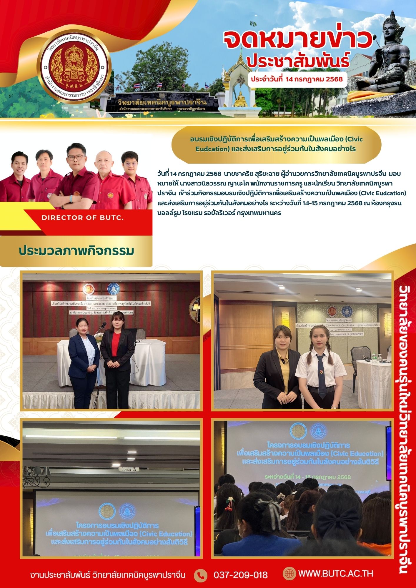 วันที่ 14 กรกฎาคม 2568 นายชาคริต สุริยะฉาย ผู้อำนวยการวิทยาลัยเทคนิคบูรพาปรจีน มอบหมายให้ นางสาวนิลวรรณ ญานะโค พนักงานราชการครู และนักเรียน วิทยาลัยเทคนิคบูรพาปราจีน เข้าร่วมกิจกรรมอบรมเชิงปฏิบัติการเพื่อเสริมสร้างความเป็นพลเมือง (Civic Eudcation) และส่งเสริมการอยู่ร่วมกันในสังคมอย่างไร ระหว่างวันที่ 14-15 กรกฏาคม 2568 ณ ห้องกรุงธนบอลล์รูม โรงแรม รอยัลริเวอร์ กรุงเทพมหานคร