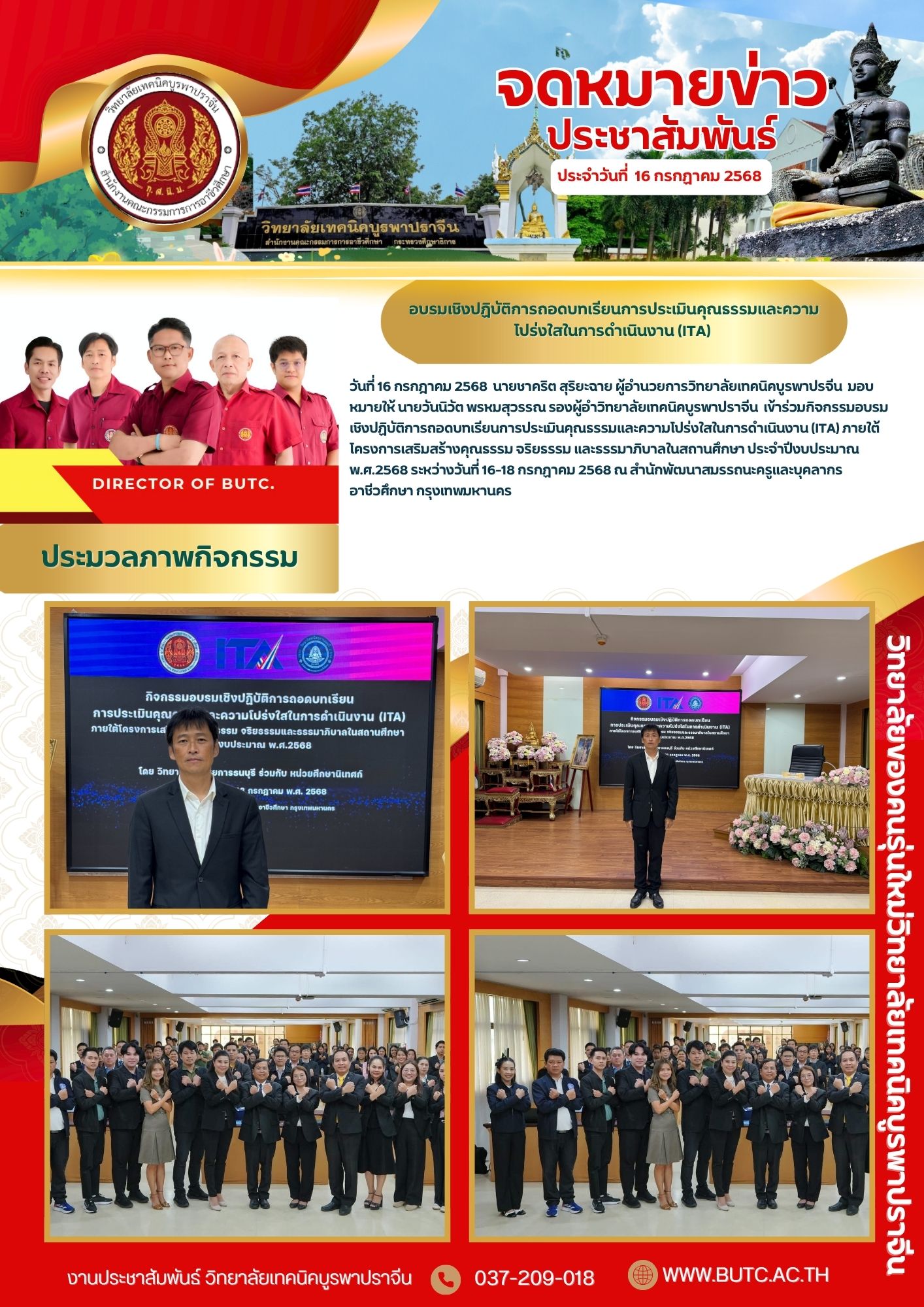 วันที่ 16 กรกฎาคม 2568 นายชาคริต สุริยะฉาย ผู้อำนวยการวิทยาลัยเทคนิคบูรพาปรจีน มอบหมายให้ นายวันนิวัต พรหมสุวรรณ รองผู้อำวิทยาลัยเทคนิคบูรพาปราจีน เข้าร่วมกิจกรรมอบรมเชิงปฏิบัติการถอดบทเรียนการประเมินคุณธรรมและความโปร่งใสในการดำเนินงาน (ITA) ภายใต้โครงการเสริมสร้างคุณธรรม จริยธรรม และธรรมาภิบาลในสถานศึกษา ประจำปีงบประมาณ พ.ศ.2568 ระหว่างวันที่ 16-18 กรกฏาคม 2568 ณ สำนักพัฒนาสมรรถนะครูและบุคลากรอาชีวศึกษา กรุงเทพมหานคร