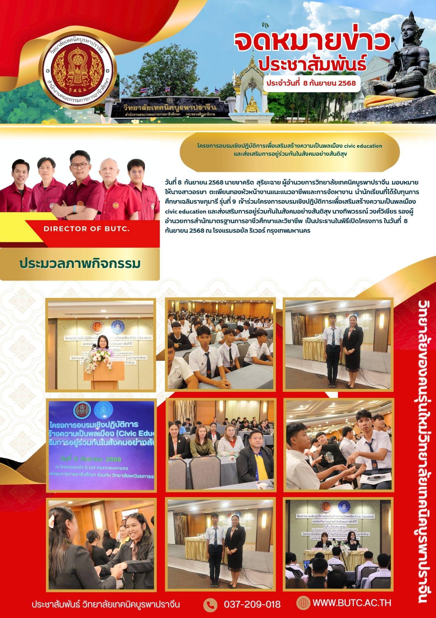 วันที่ 8 กันยายน 2568 นายชาคริต สุริยะฉาย ผู้อำนวยการวิทยาลัยเทคนิคบูรพาปราจีน มอบหมายให้นางสาวอรษา ตะเพียนทองหัวหน้างานแนะแนวอาชีพและการจัดหางาน นำนักเรียนที่ได้รับทุนการศึกษาเฉลิมราชกุมารี รุ่นที่ 9 เข้าร่วมโครงการอบรมเชิงปฏิบัติการเพื่อเสริมสร้างความเป็นพลเมือง civic education และส่งเสริมการอยู่ร่วมกันในสังคมอย่างสันติสุข นางทิพวรรณ์ วงศ์วิเชียร รองผู้อำนวยการสำนักมาตรฐานการอาชีวศึกษาและวิชาชีพ เป็นประธานในพิธีเปิดโครงการ ในวันที่ 8 กันยายน 2568 ณ โรงแรมรอยัล ริเวอร์ กรุงเทพมหานคร